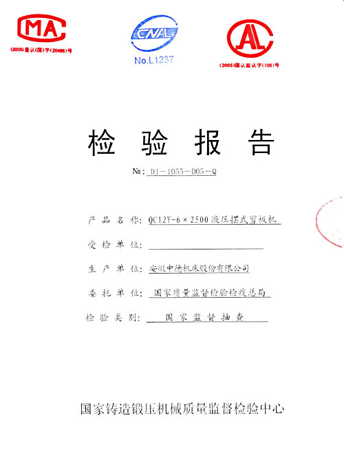 根據(jù)2006年第4季度剪板機(jī)國(guó)家監(jiān)督抽查實(shí)施方案,受?chē)?guó)家質(zhì)量監(jiān)督檢驗(yàn)檢疫總局委托,國(guó)家鑄造鍛壓機(jī)械質(zhì)量監(jiān)督檢驗(yàn)中心,于2006年9月23日,對(duì)本公司產(chǎn)中德牌液壓擺式剪板機(jī)進(jìn)行了現(xiàn)場(chǎng)檢驗(yàn)。近日,我公司收到了本次抽檢的結(jié)果通知單及檢驗(yàn)報(bào)告,結(jié)果為:合格。