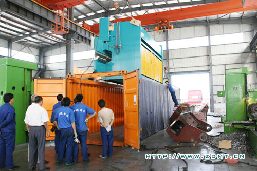 這套大型機床主機由兩臺250噸6米的數(shù)控板料折彎機組成,可實現(xiàn)單機及雙機聯(lián)動工作的功能,極大的方便了大型生產(chǎn)中的多元化要求。機器總重達50余噸,可完成12米的工件,對裝箱的操作技術要求很高,但由于我們機械化的車間及熟練的技術人員,裝箱過程雖然繁瑣但并不費力。由于整機超高超長,采用的是兩個開頂箱,將兩臺主機分開來裝??紤]到機器要在海上航行近一個月,裝箱的工作人員做足了防護措施:底部鋼條固定,兩側鐵絲固定,外加透明塑料膜,頂部自制框架固定并套上雨布等等,以免在運輸過程中造成對機器不必要的損壞。