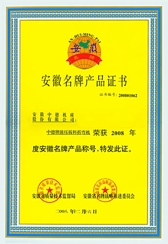 中德牌液壓板料折彎機喜獲2008年“安徽省名牌產(chǎn)品”的殊榮,這是繼2005年中德牌液壓擺式剪板機獲“安徽名牌產(chǎn)品”之后,中德機床的質(zhì)量和信譽又一次獲得認可。與此同時,中德牌液壓擺式剪板機也順利通過安徽名牌產(chǎn)品的復(fù)審,證書的有效期將延長至2013年。