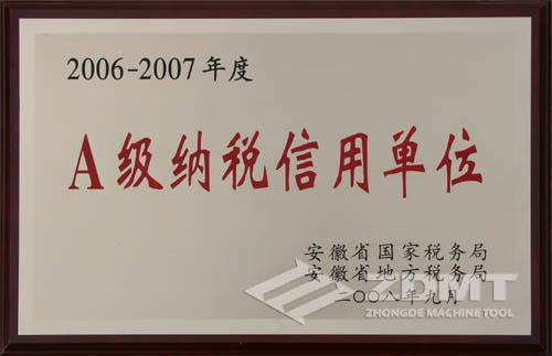 近日,安徽省國家稅務局、地方稅務局聯(lián)合表彰了2006-2007年度納稅信用等級A級納稅人,中德機床也再次被授予了“A級納稅信用單位”的證書。