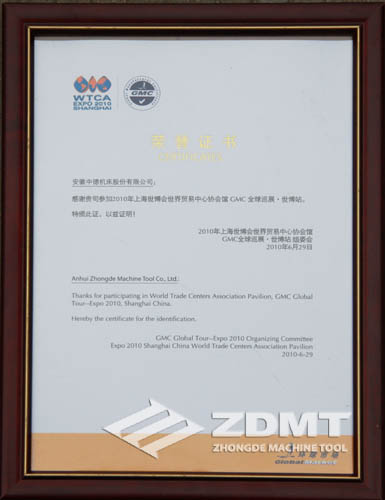 2010年7月1日下午,一場貼上“中國制造,世界的驕傲”標簽的各行業標志性品牌在上海世博會世界貿易中心協會GMC館高調亮相。安徽中德機床股份有限公司領航國內機床行業其他品牌,作為行業代表身份出席,參加了企業亮燈儀式同時接受GMC委員會頒發的獎牌和證書,正式成為“2010年世博會世界貿易中心協會館贊助商GMC成員”,此舉在對中德機床綜合實力提升和在行業中領先地位的充分肯定的同時,也對我們提出了更高的要求,我們將為創建一個具有國際競爭力的卓越企業、鍛造一個具有百年發展的民族品牌而繼續努力!